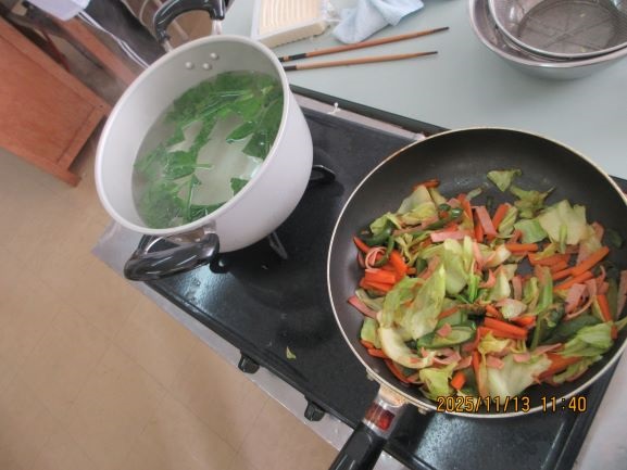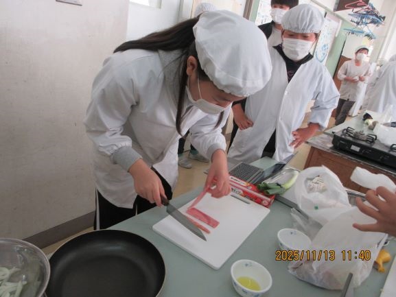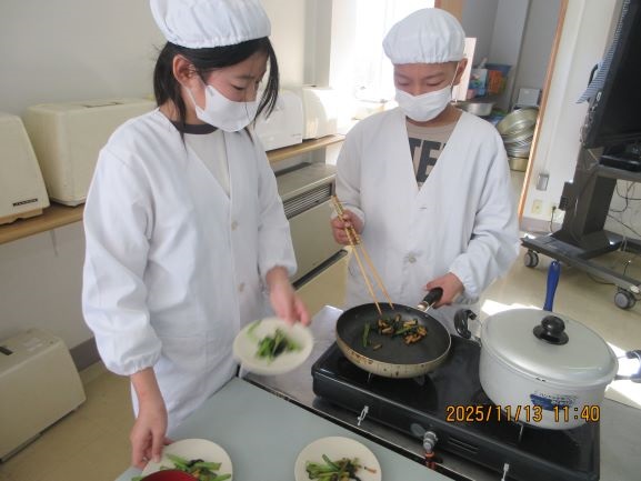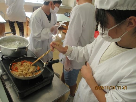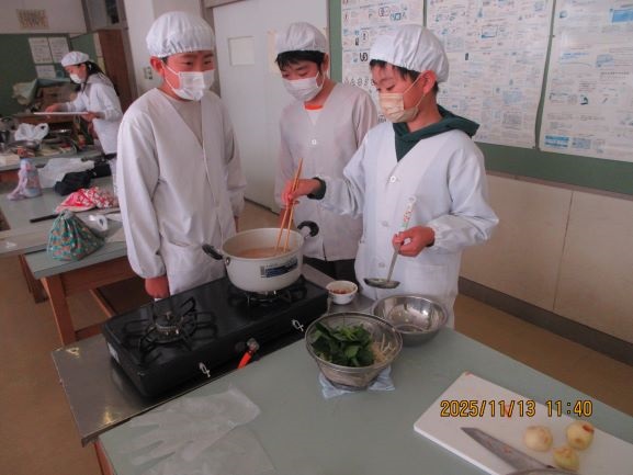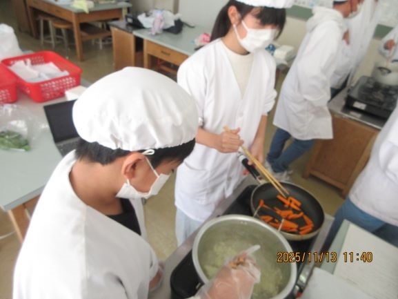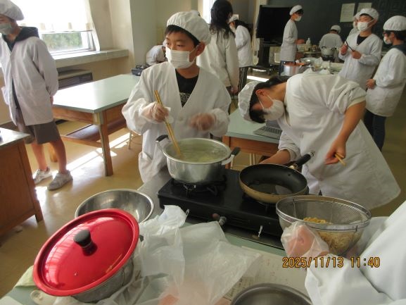 調理室に入ってみたら、班ごとに違うメニューを作っていました。班ごとに異なるメニューは、自分たちで考え、タブレットでも調べて計画したそうです。班ごとに異なる調理ですから、材料も調味料も、調理法も違うので、全員が懸命に調理している姿がありました。どの班の料理もおいしそうでした。