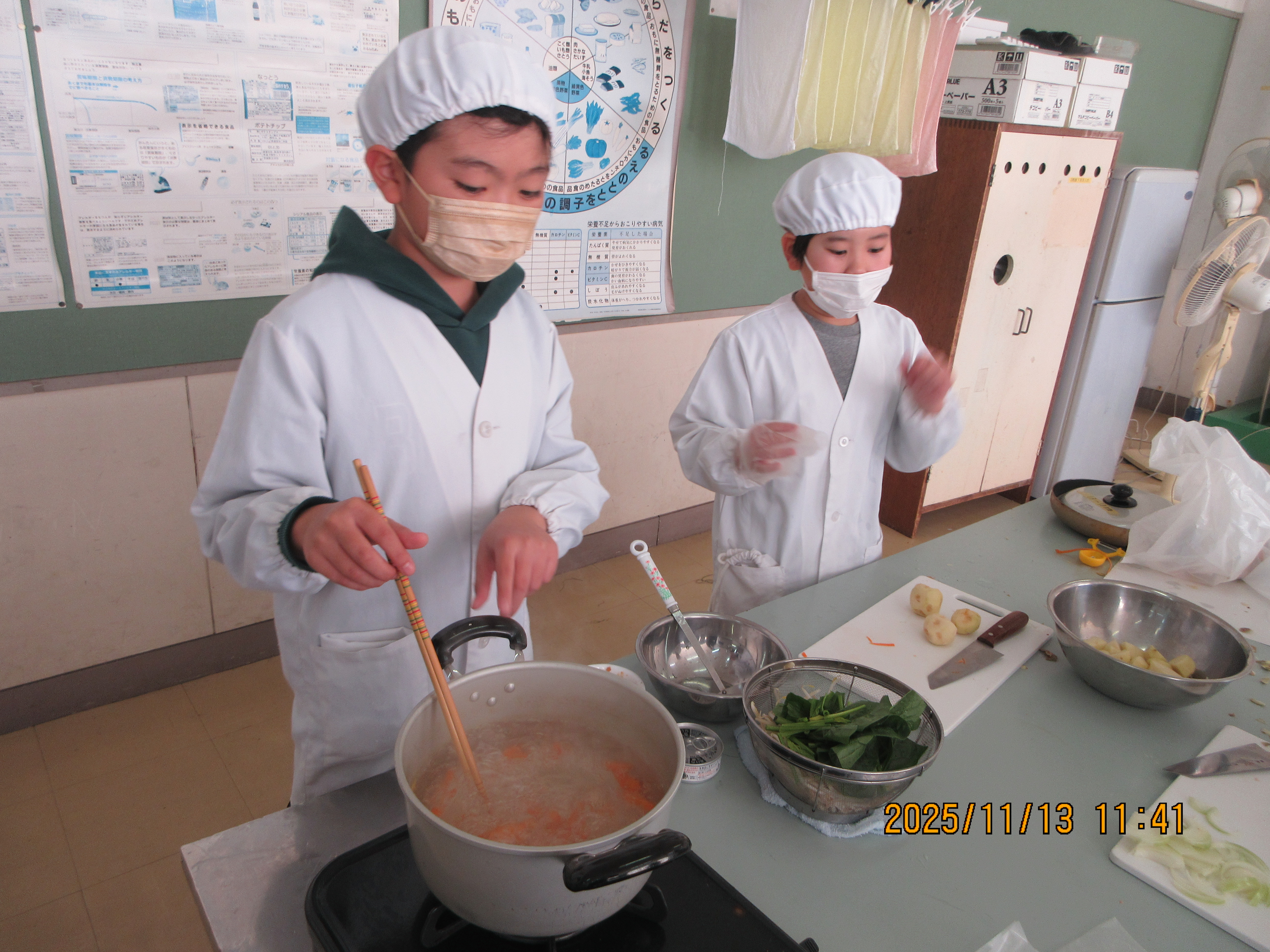 今日、6年生が調理実習を行いました。階段を3階まで上がっていく途中で、ものすごくおいしそうな、良い匂いはするのですが、何の料理かはなかなかわかりません。料理にはほんのちょっと自信があったのですが、野菜をいためた匂いや味噌の匂い、卵焼きの匂いもするような感じでした。