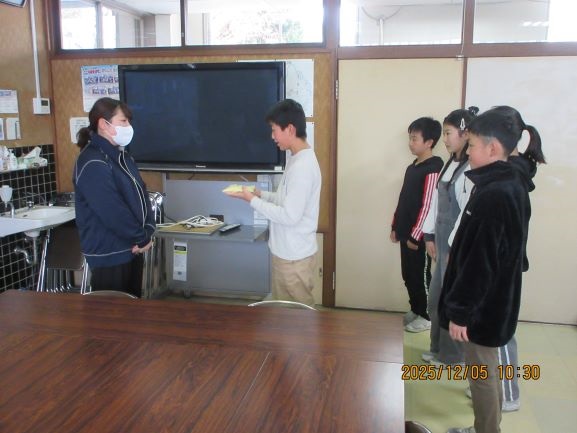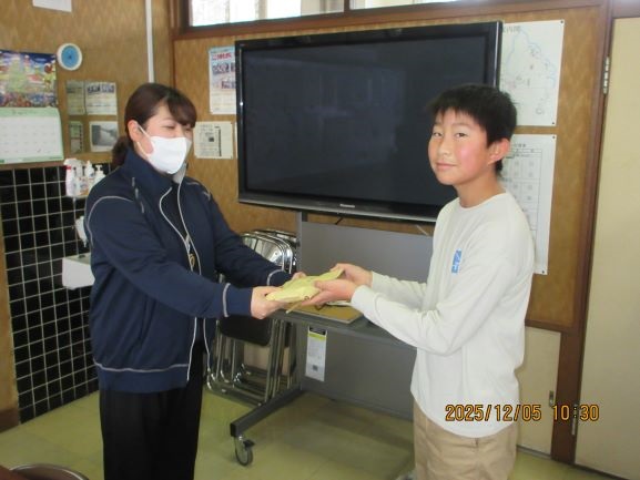 中間休み、全校生で取り組んだ「赤い羽根募金」をご担当の方にお渡ししました。市社会福祉協議会のご担当の方が来校され、校長室で「全校生で募金したお金です。ぜひ、困っている人のために使ってください。」との言葉と共に、「集まった11,096円」をお渡ししました。「大切に使わせていただきます。」との温かい言葉で受け取っていただきました。