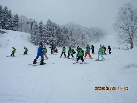 今日は3・4年生のスキー教室に行ってきました。昨日も今日も蔵王は氷点下10℃以下ですが、時折陽射しが出たり、スッキリ晴れ渡ったり、急に吹雪になったり、強い風で雪が舞い上がってホワイトアウト状態になることもありました。しかし、くもりや小雪の時間が長くあり、冷えて滑りやすい雪質でしたので、スキー日和であったと思います。