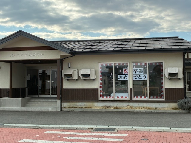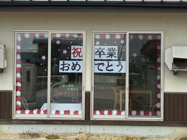 いよいよ最終週の朝、登校する児童のみなさんとあいさつしていると、「グループホームおおさと」さんの窓に「卒業おめでとう」のメッセージがありました。登校する子供たちが先日贈呈させていただいた車椅子と共に、心温まるメッセージを準備していただき、子供たちはみんな、ニコニコと学校に入っていきました。
