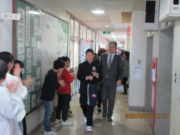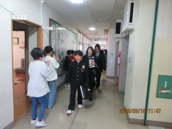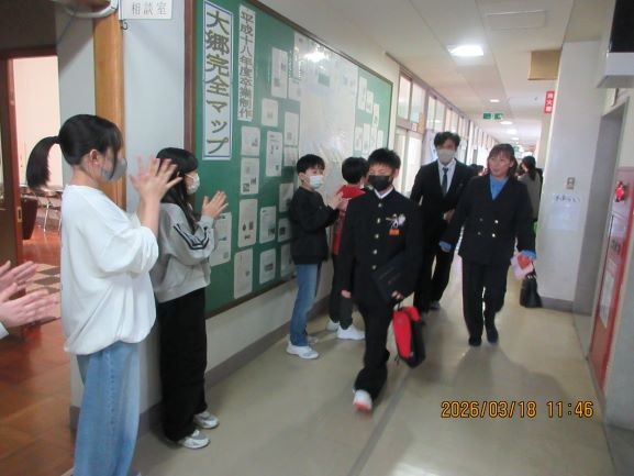 卒業生が最後の学級活動を終えて体育館に集合し、記念撮影をし、5年生を中心に在校生による門出式がありました。昇降口までの廊下に在校生が並び、拍手で見送りました。