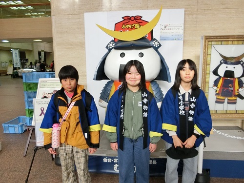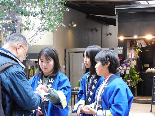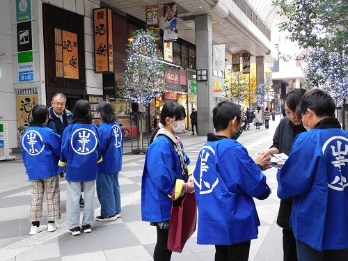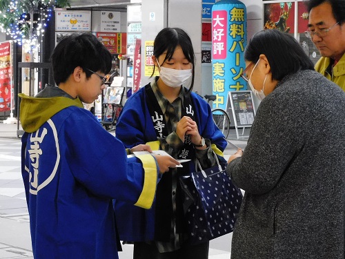 11月21日(金)、山寺を仙台でPRするため、サンモール一番町商店街にてパンフレットを配布しました。昨年作成したパンフレットをさらに良いものにしようと、動画撮影・編集にも挑戦し、QRコードから山寺の見どころを映像でご覧いただけるようにしました。仙台では50人以上の方にパンフレットをお渡しすることができました。多くの方々のご協力をいただきながら、貴重な経験を通して大きな学びを得ることができました。