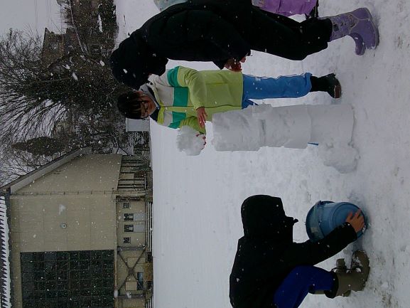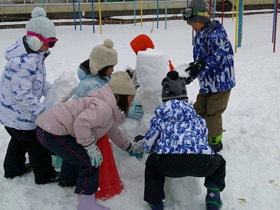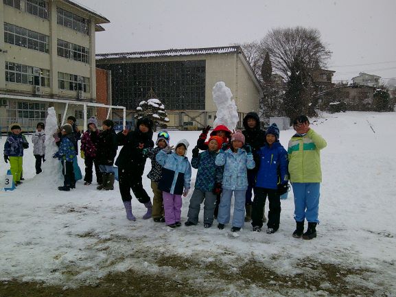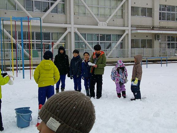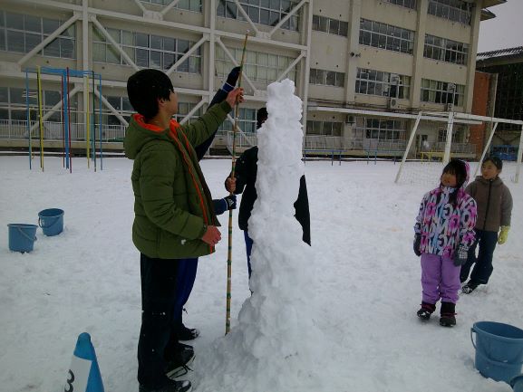 今日のロング昼休み、健康委員会が企画した「雪積み大会」がグラウンドで行われました。あかねっこ班(縦割り班)対抗で、雪を積み、その高さを競います。時間は10分間。バケツを使ったり、雪玉を作ったり、手で補強したり、班ごとに協力して高く高く積みました。2メートル以上の作品もあり、さながら小さな樹氷のようでした。蔵王の子ども達、今日も冬を楽しんでいます!