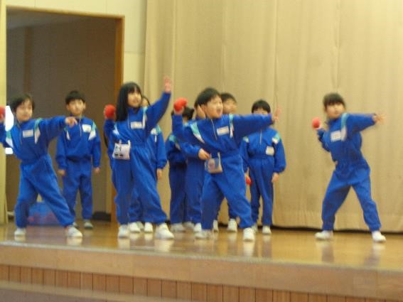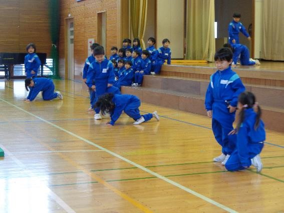 今朝の朝会は、1年生の学習発表会でした。1.体を動かす場面と2.歌を歌う場面の2部構成になっていました。まず1の体を動かす場面では、走る・跳ぶ・投げる・体を支える・動物歩き・よじ登りの6つの動きを一つ一つ丁寧に行っていました。特に動物歩きでは、クマ・アザラシ・ウサギの3つの動物の動きについて、体の向きや手の付き方、動かす方向などを工夫しながらとてもリアルに表現していました。