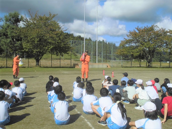 山形市西消防署から3名の方に来ていただき、避難について講評をいただいたり、消火器の使い方や火事ぶれの仕方を教えていただいたりしました。
