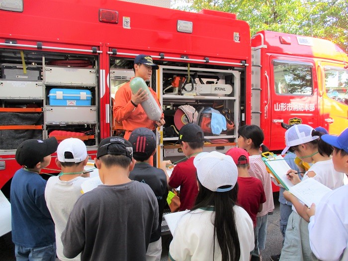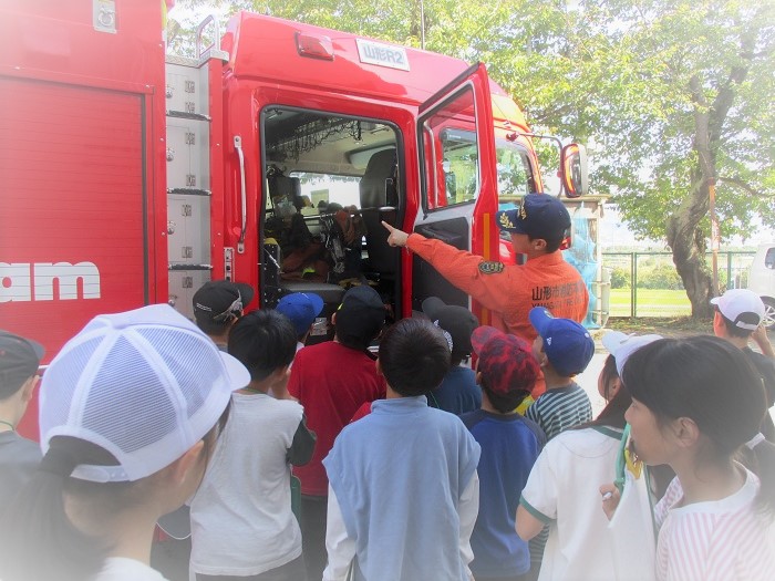 3時間目、3・4年生は消防車見学学習を行いました。消防署の方から仕事の内容や消防車について説明をしていただきました。その後、子どもたちからたくさんの質問があり、ひとりひとり丁寧に回答していただきました。