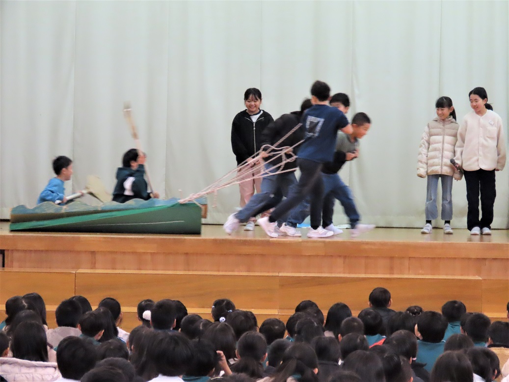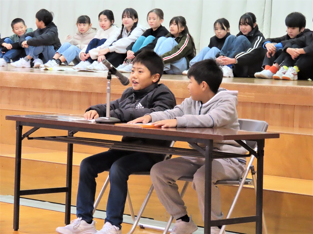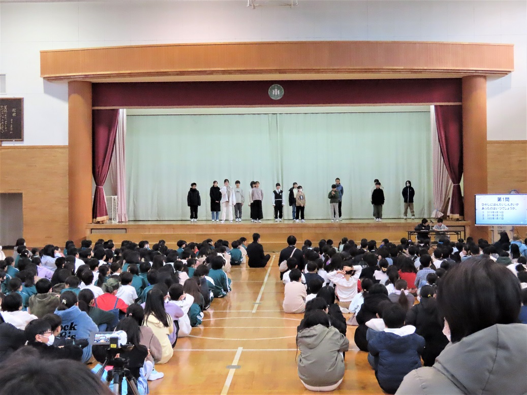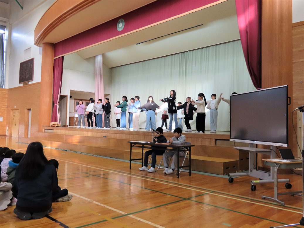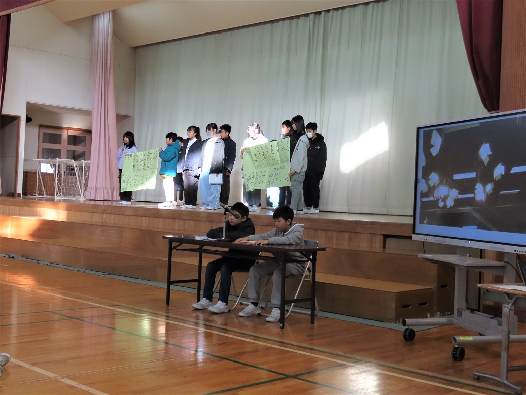 5年生は、今年度、様々な体験学習に取り組んできました。発表会では、その中から、『自然体験宿泊学習』『トヨタ自動車工場・震災遺構見学』『さくらんぼテレビ局見学』『リズムダンスの学習』を選び、体験してきたことや学んできたことを発表しました。高学年らしく、劇化したり電子黒板を使ったり等、工夫して発表しました。