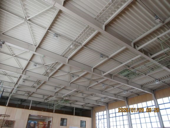 何度か体育館工事の進捗状況をお知らせしてきましたが、いよいよ最終段階です。昨日は「消防点検」が完了したそうで、間もなく完成です。