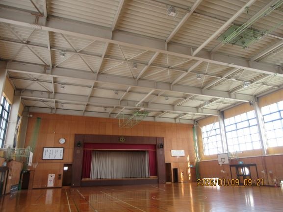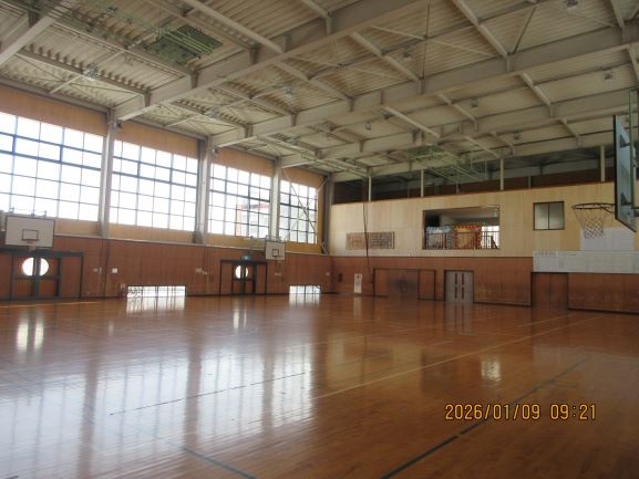 今朝、体育館に行ってみると、ピーンと冷えた空気でしたが、足場も床面のカバーも撤去されており、いよいよ使える日が近づいていることを実感できました。整備された体育館が、元気な子供たちを待っているように感じました。