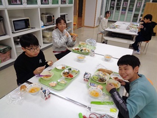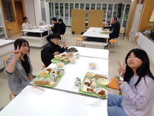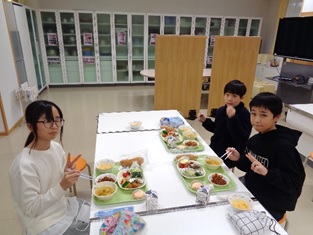 6年間で一度しかないバイキング給食。給食センターの栄養士の方のお話を聞き、さっそく準備を行いました。栄養素ごとに仕分けられた献立を選択しながらおいしくいただきました。