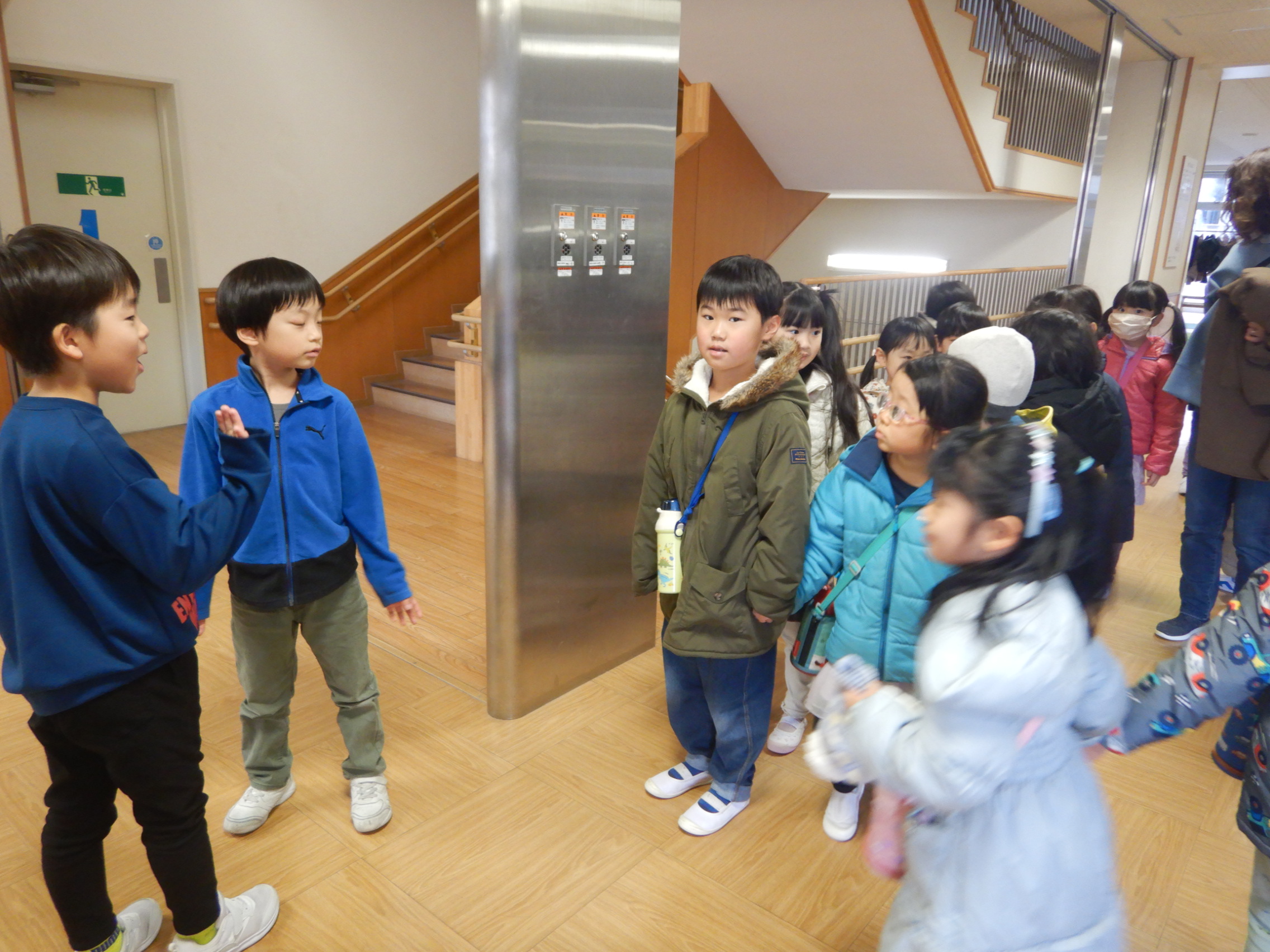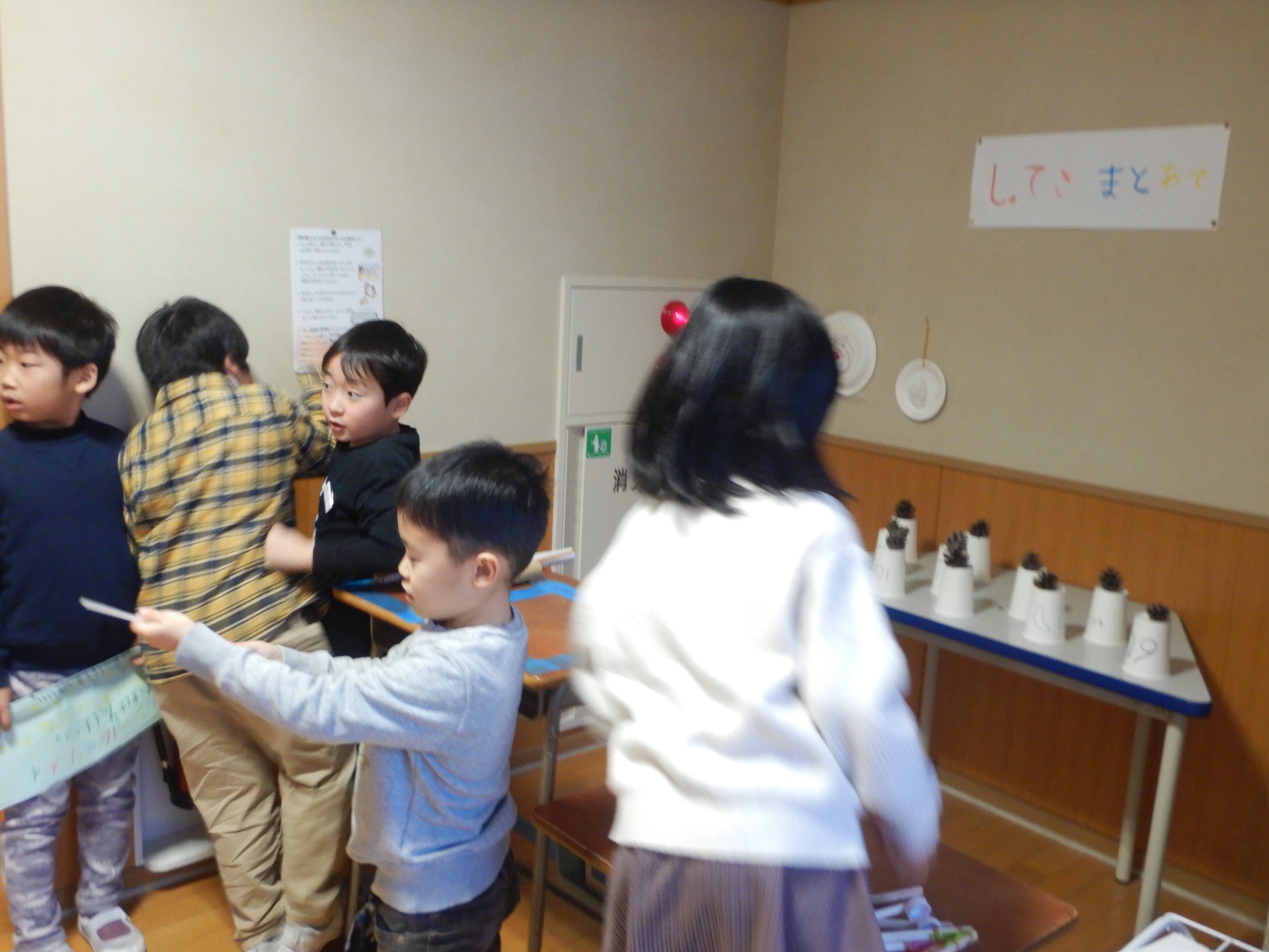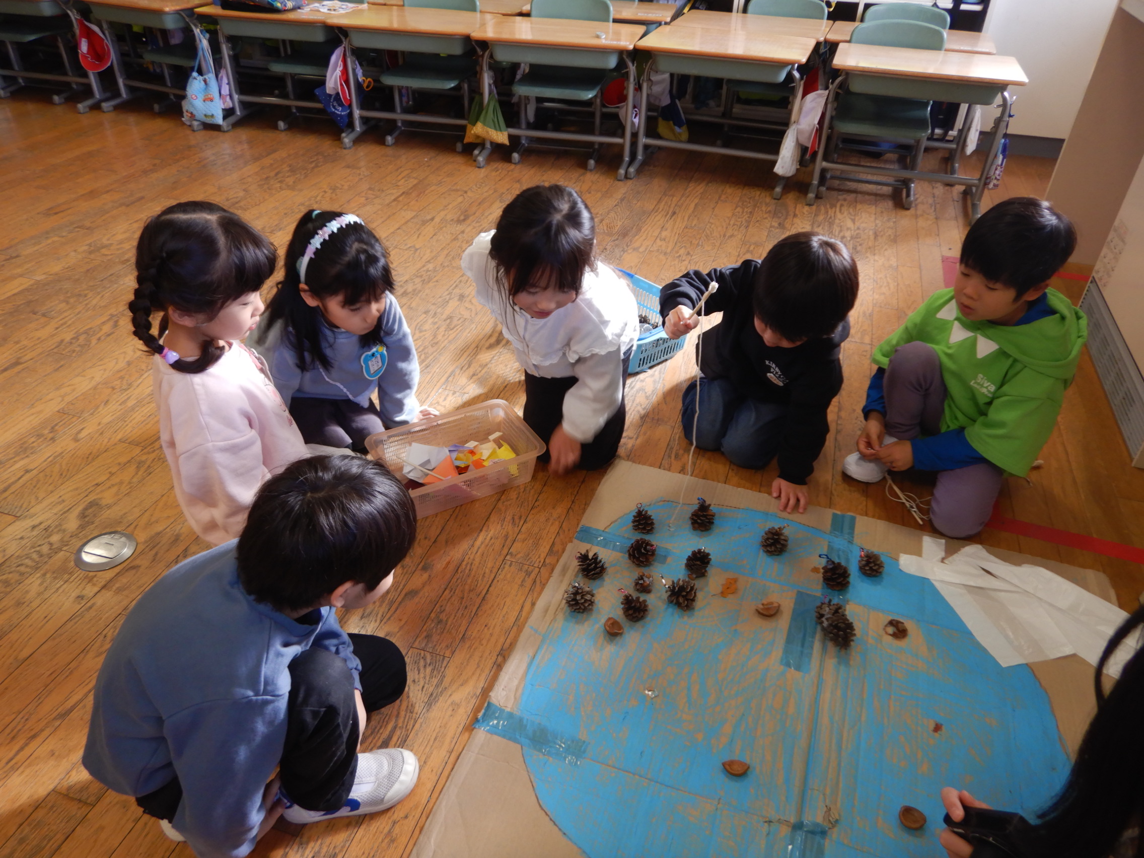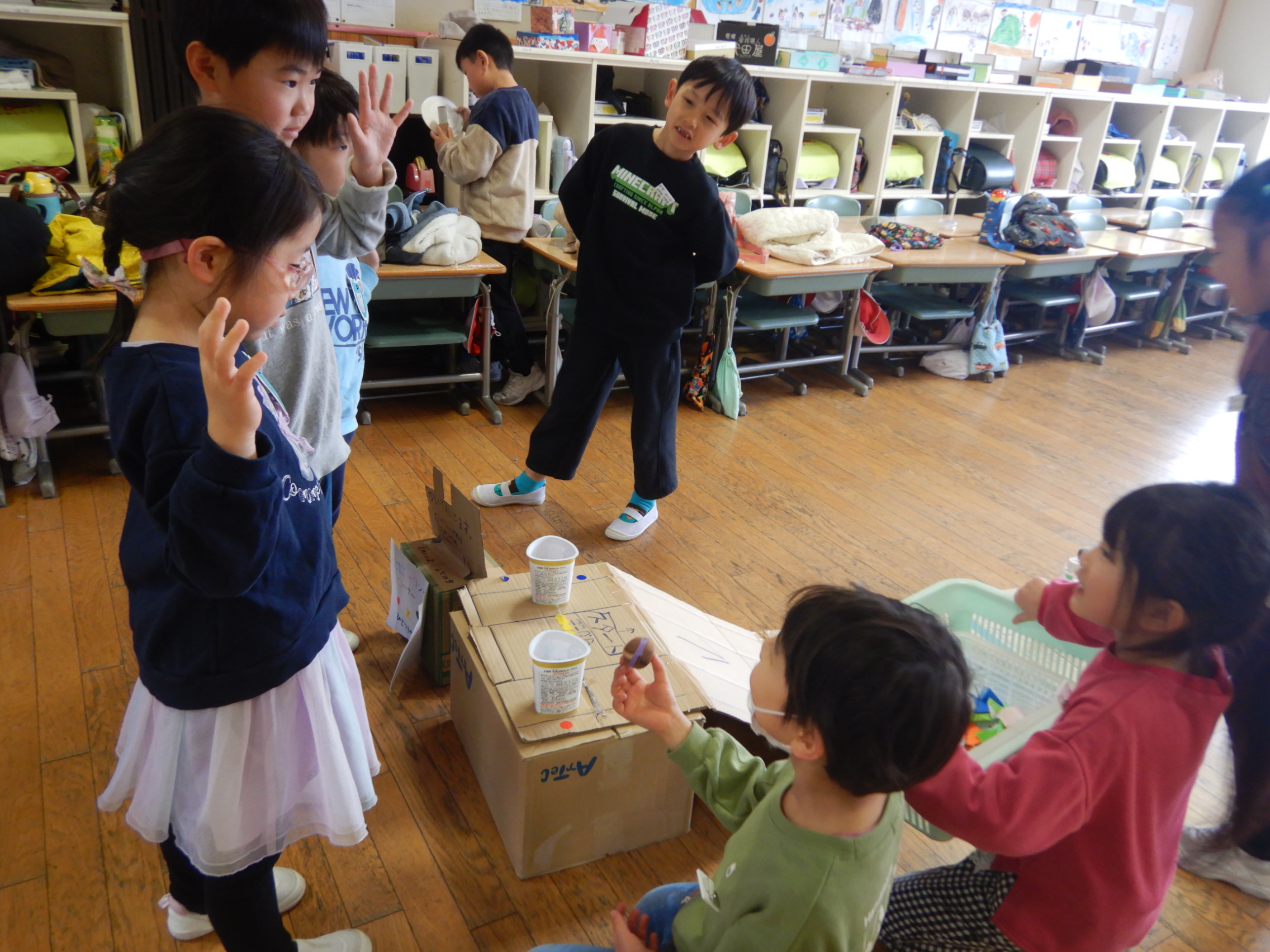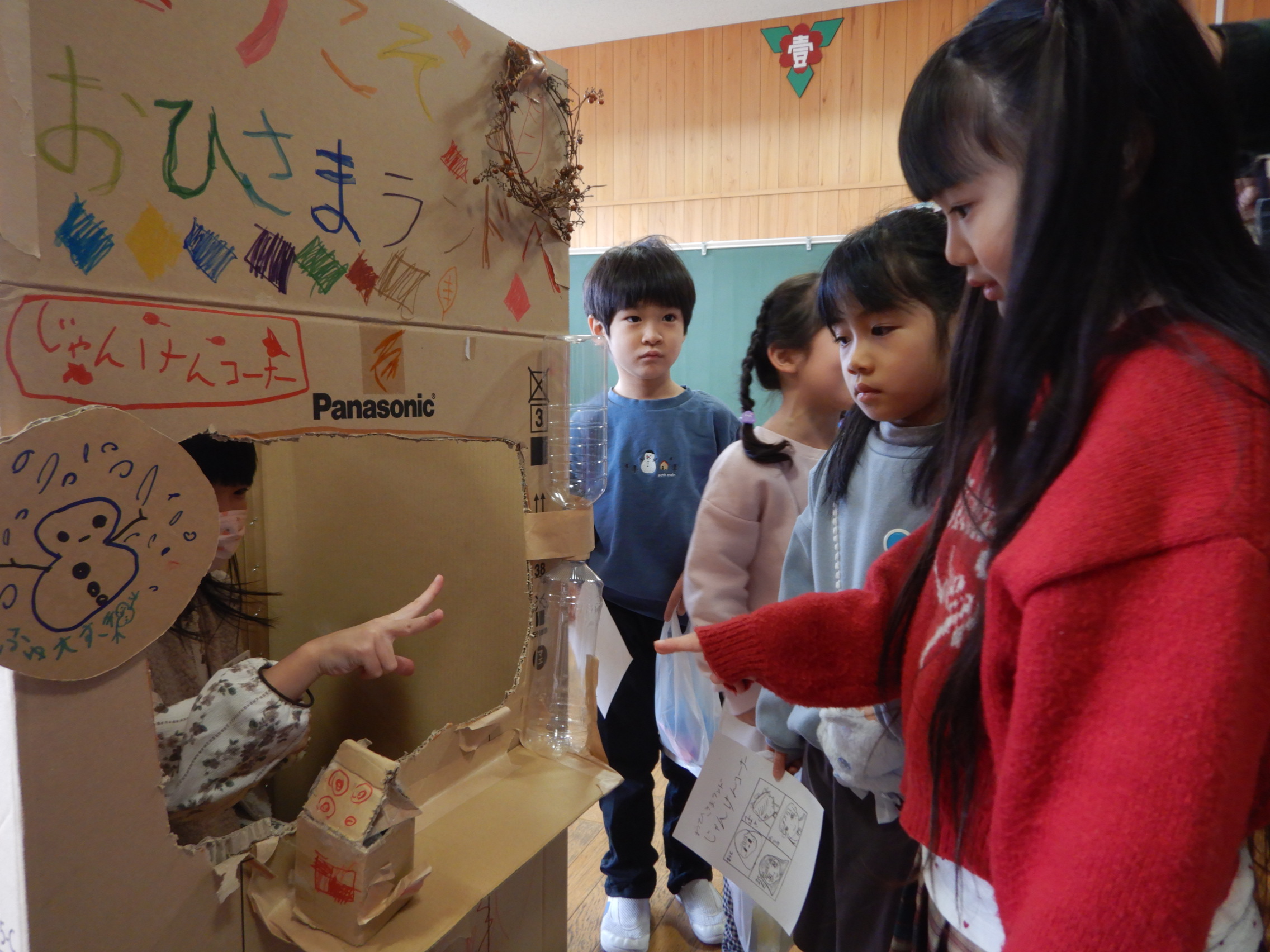 1年生が生活科でつくった遊び場に、近くの幼稚園の園児たちを招待しました。「やさしくおしえてあげよう」「まいごにならないように手をつないであんないしよう」などのめあてを考えて実行しました。年上のお兄さんお姉さんとしての振る舞いが頼もしくて、来年2年生になるためのちょっとした準備時間になりました。