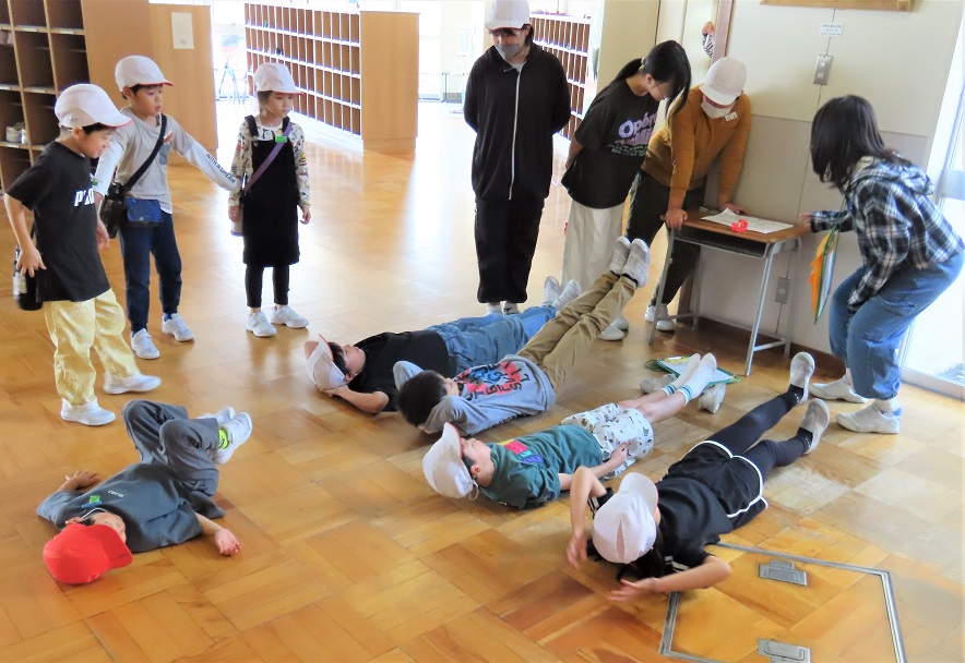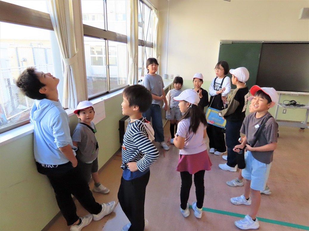スタンプラリーは校内外全ての場所を使って行いました。こういう活動には九小のつくりはぴったりです。教室だけではなく、オープンスペースやホールなど、いろんな場所に問題が置けるので、どの班も6年生を先頭に次々に移動し、課題をクリアしていきました。