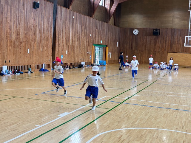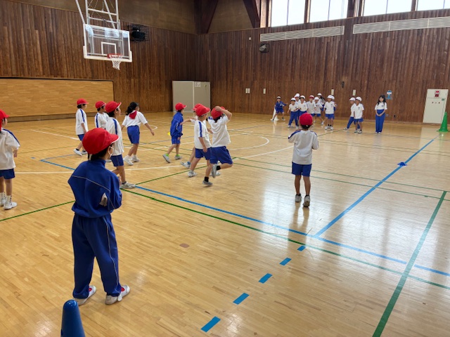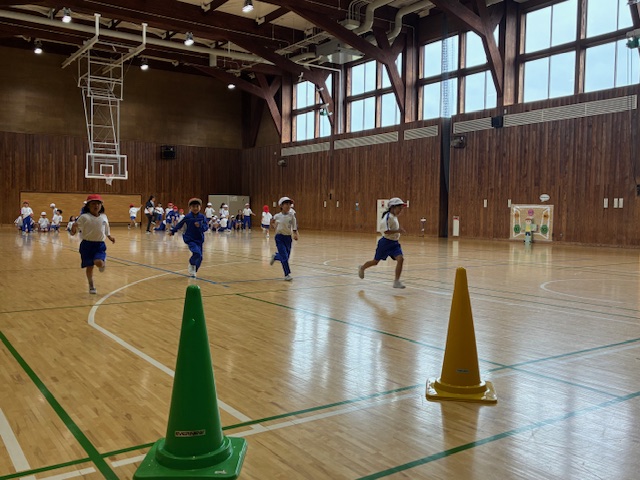 今日の仕上げに「ドッヂボール」をしました。ボールを持った外野の選手が走って追いかけたり、ボールの動きに合わせて一斉に動くのが楽しく、夢中になって取り組みました。