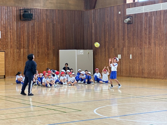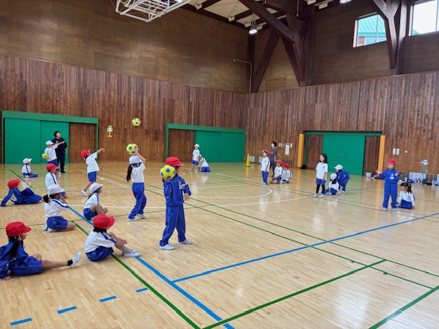 今日は「べにっこ」での体育の授業の日です。体育館に着くと準備運動からはじめ、早歩き、スキップ、もも上げ、ダッシュなどで体を温めました。その後で、ボールを使ってキャッチボールをして、ボールの投げ方やキャッチのしかたを練習しました。