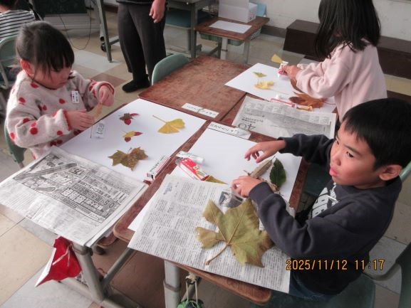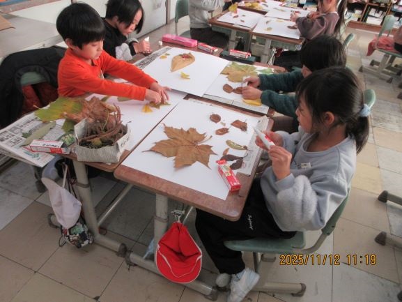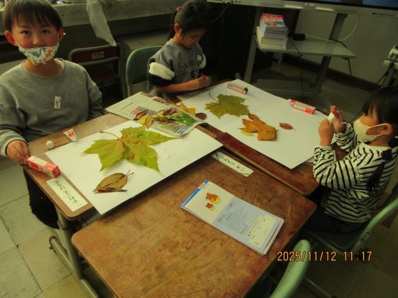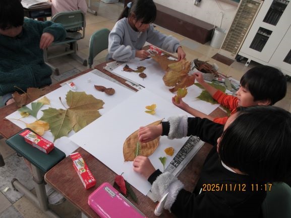 一年生が3校時、学校周辺の落ち葉を使って思い思いの絵を描きました。2時間目に落ち葉を拾いに行き、様々な形や色の落ち葉を集めてきました。電子黒板には、秋の落ち葉の種類が表示され、自分が集めた葉の種類がわかります。一番大きい葉は、やはり学校のシンボルツリーのすずかけの木です。