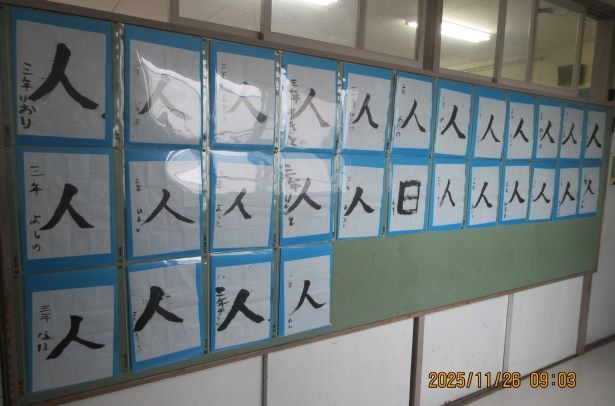 3年生は書道で書いた「人」。みんなの顔をイメージしながら「人」を見せてもらいました。同じ漢字でも、それぞれの良さがあり、力強さがあります。お手本はあるのでしょうけれども、「人という字は、人と人とが支え合い…」という話を思い出しながら見入りました。