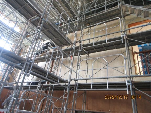 今日、体育館に行ってみると、天井付近は足場が組んであるので見えませんが、壁面の壁はきれいに張り替えられているのがわかりました。きれいになった体育館で、思いっきり運動したり、全員がそろって集会をしたりできることが、今から楽しみになっています。