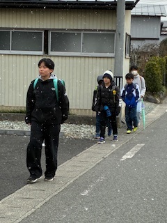 久しぶりに雪が舞う朝になりました。いつもよりも肌寒く、時折風も吹く中の登校となりました。しかし、子供たちはやっぱり元気で、ニコニコ登校する姿があり、朝から元気をもらっています。