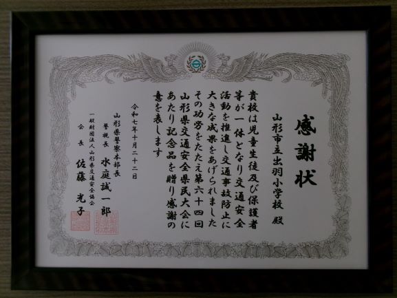 このことは、本校児童の交通安全に係る様々な取り組みを脈々と継続していただいた、本地区の関係者及び関係団体の皆様の並々ならぬご尽力の賜物でございます。お力添えを賜りました皆様に、心より御礼申し上げます。