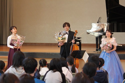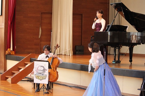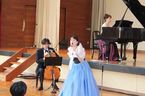 山形県教職員互助会主催のスクールコンサートを開催しました。「トリオ・アラモーレ」様をお招きし、歌とピアノとチェロのアンサンブルを楽しみました。クイズに盛り上がりながら、美しい音色を楽しみました。童謡やクラシック、アニメソングまで幅広いジャンルの音楽をオリジナルの編曲で演奏していただきました。心豊かな時間を過ごすことができました。