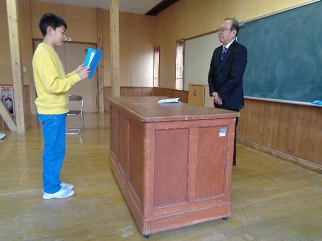 最後に、6年児童代表の保科絢人さんが、これまでに7,300人以上の先輩方が築いてくださったこの南山形小、そして同窓会に仲間入りすることで、次の中学校というステージにしっかりと進むことや、何事にも責任をもって取り組んでいくことを、小林会長様に力強く伝えることができました。
