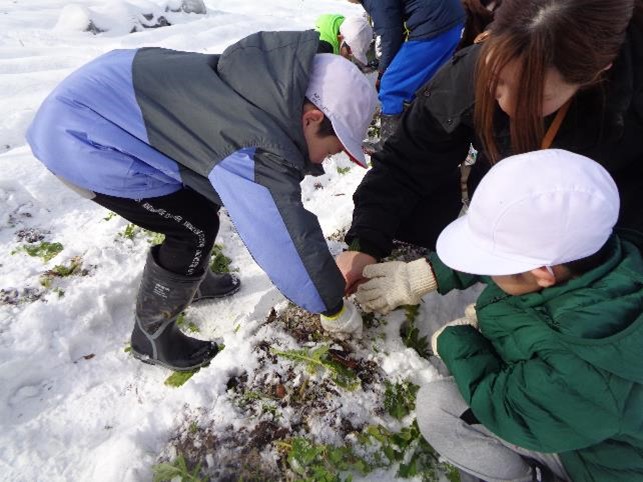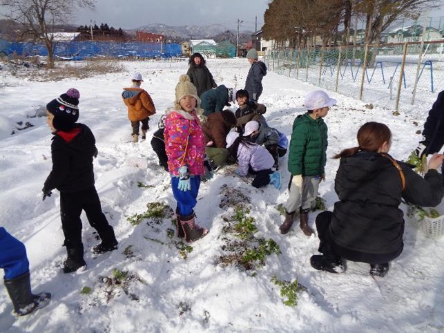 すぎのこ学級の皆さんが、秋から大切に育ててきた大根を収穫しました。寒さで畑の土の表面が凍っていて、その上に雪も積もっていたので、大根を掘り起こすのはなかなか大変な作業でしたが、みんなで声を掛け合い協力し合って、たくさんの大根を収穫することができました。