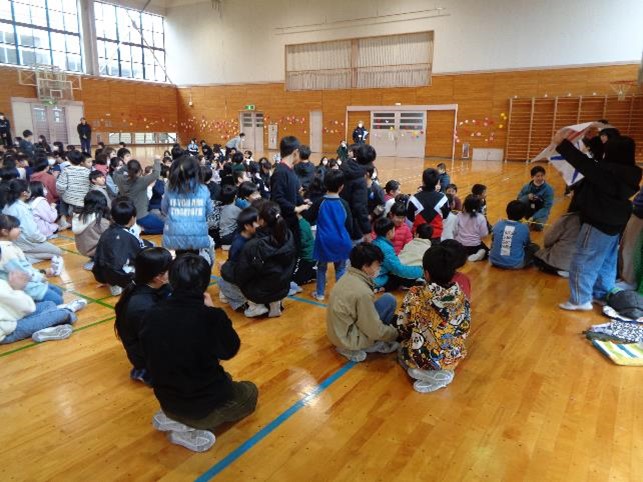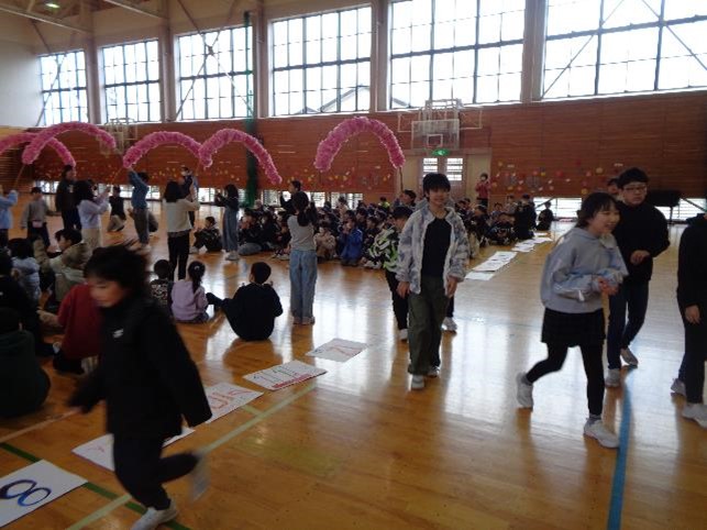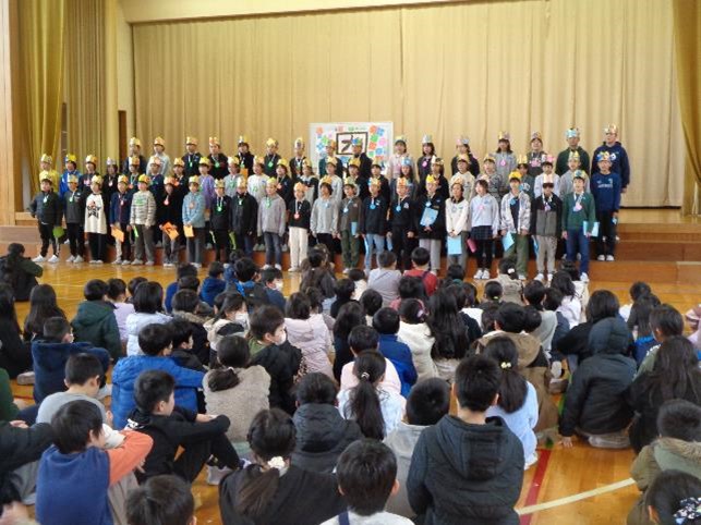 最初に、今年度1年間じっくりと関わってきた1年生と共に、6年生が入場しました。そしてひな壇に座り1〜5年生と対面する表情は、とても穏やかでにこやかなものでした。その後は、みんなで楽しめるじゃんけん列車やクイズで、賑やかな時間を過ごしました。