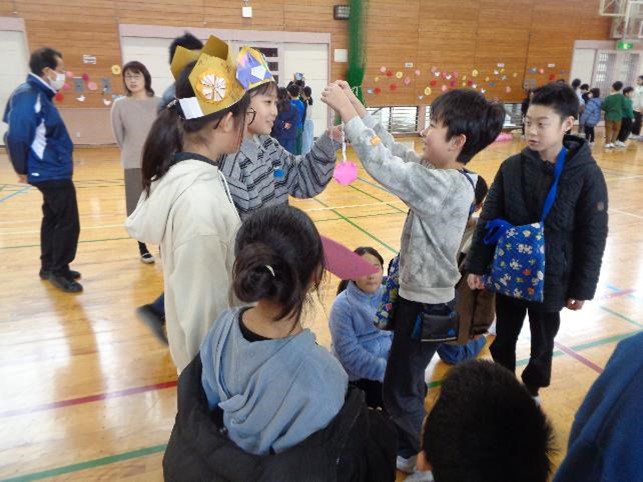 次に、1年生から6年生に冠のプレゼントがあり、そこからなかよし班でメッセージカードを贈呈する時間となりました。お互いに伝えたい思いを言葉にして、精一杯語り掛けている様子がとても微笑ましかったです。