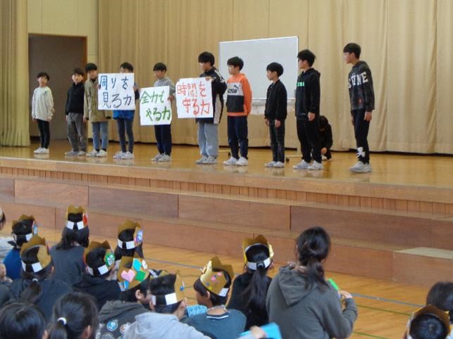 今回実行員会を組織して、中心となって取り組んできた5年生からは、「恩」という言葉を添えながら、これまでお世話になった6年生に、力強いメッセージが届けられました。6年生から最後に、歌と呼びかけで1〜5年生へのお返しの気持ちが伝えられました。