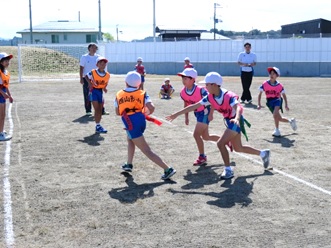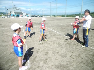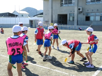 山形市ラグビーフットボール協会の方3名を講師に迎え、3・4年生がタグラグビーを行いました。タグラグビーは、体の接触をなくして、ボールを持った人の腰に付けたタグ(目印)を取るとその人はボールをパスしなければいけません。けがを恐れずに手軽にラグビーと似たスポーツに親しむことができます。