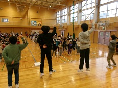 後半は、6年生へのエールの練習。事前に共有フォルダに入れた録画をもとに、掛け声や振り付けを練習して臨みました。