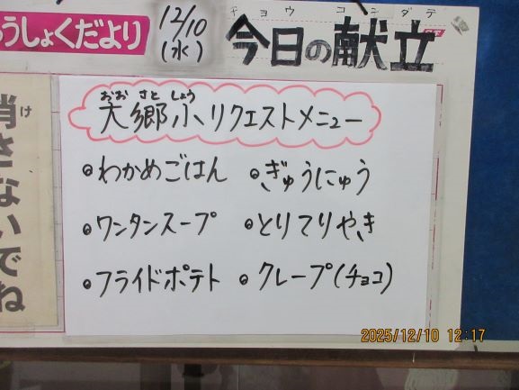 今日は「大郷小リクエスト献立」の日です。山形市給食センターの方が来校され、準備から後片付けまで見てくださいました。ちょうど準備が始まった時間、PTAの役員の皆様の会議が終わった時でしたので、「ちゃんとあいさつして給食室に入るんだ」「しっかりそろって準備するんだ」と、給食室前の様子を見ていただく機会にもなりました。