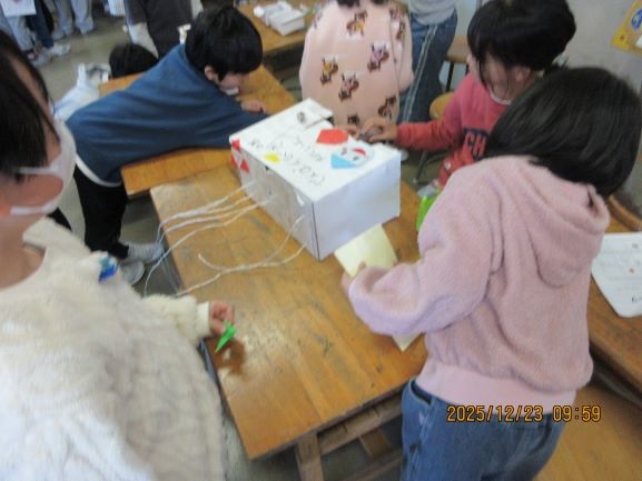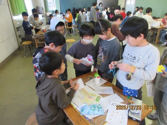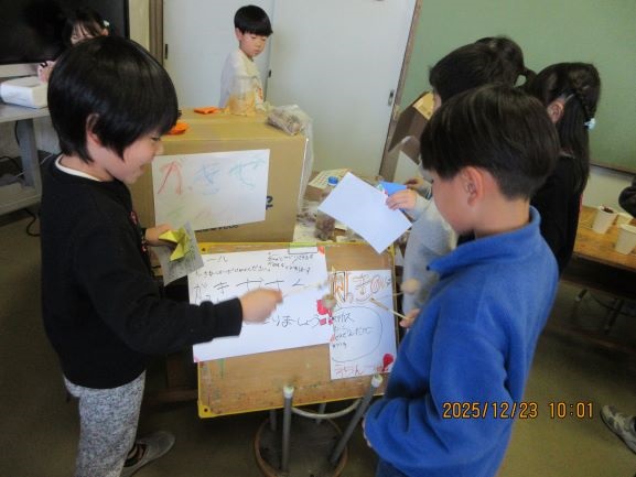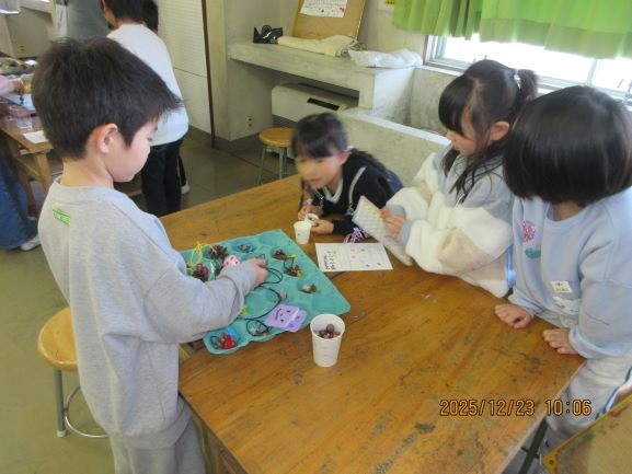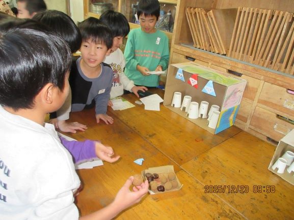 2年生がおもちゃをつくり、1年生を招待して一緒に遊ぶ時間をつくってくれました。今日は、1年生が「秋さがし」で見つけ、集めたものを使って作ったもので、2年生を招待しました。「秋のテーマパーク」にはたくさんの「お店屋さんが出店していました。「アクセサリー屋さん」「くじ引き屋さん」「けん玉屋さん」「どんぐりごま屋さん」「カードゲーム屋さん」「がっき屋さん」「ボーリング屋さん」「まとあて屋さん」です。