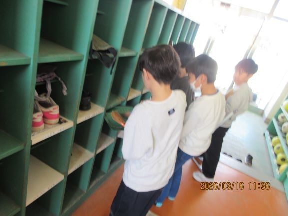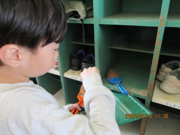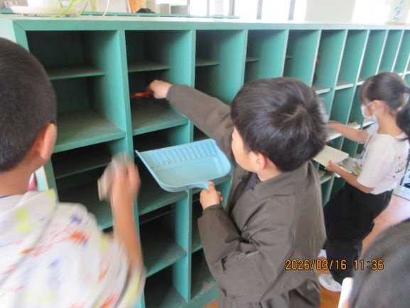 間もなく今年度も終わりですので、学習用具を持ち帰り、使ったところをきれいにする活動が始まっています。今日は2年生が毎日使った下足箱を掃除していました。