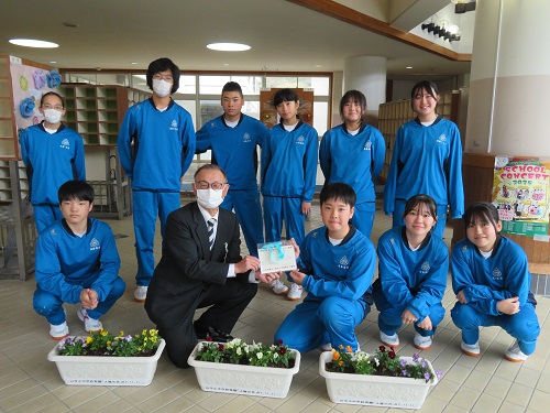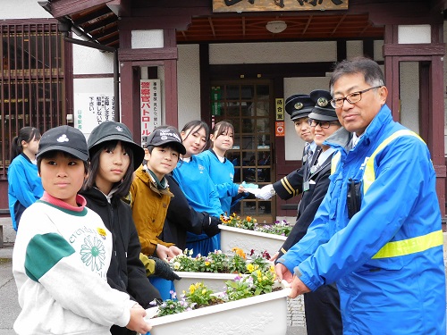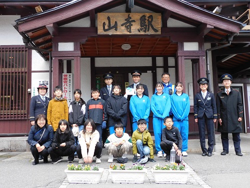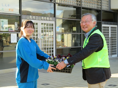 11月11日(火)には、山寺駅、通在所、サニーヒル山寺、郵便局、山寺芭蕉記念館、遠藤物産の6か所にプランターを寄贈しました。山寺小中学校の児童生徒全員で、思いやりの花を咲かせていくことを誓いました。