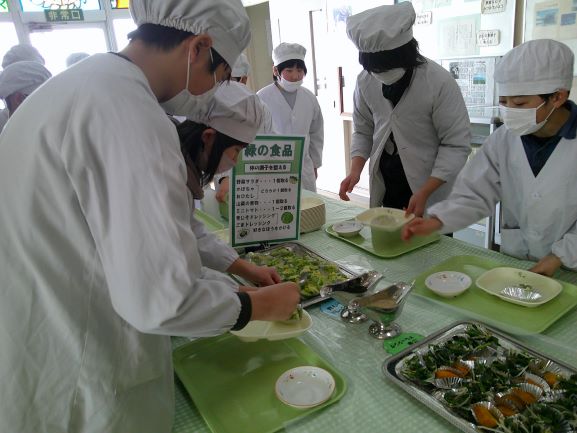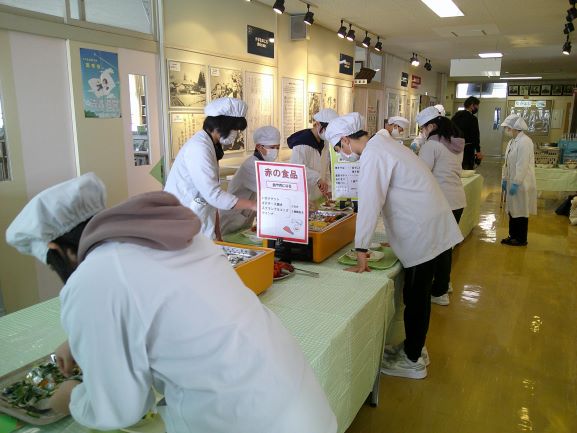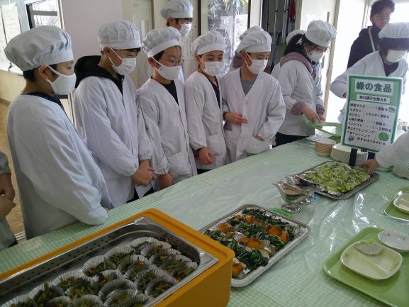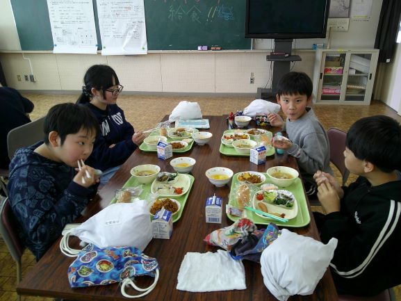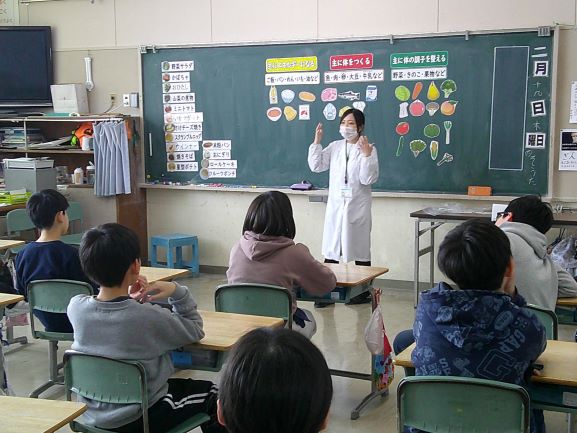 2月19日(木)、5,6年生はバイキング給食でした。給食センターの職員さんや栄養士さんにおいでいただき、はじめに教室で食品の栄養について学習しました。その後、たくさん並んだ「緑の食品(体の調子を整える)」「赤の食品(主に体をつくる)」「黄色の食品(主にエネルギーになる)」の中から栄養バランスやカロリーを考え一人一人選んでいきました。どのメニューもとっても豪華で美味しそうで、何をどれくらい選ぶか、子ども達は大変迷っていたようです。友達とおしゃべりしながら実に楽しく食べました。完食です。ごちそうさまでした。