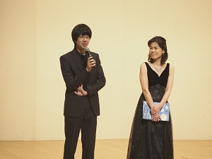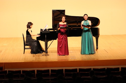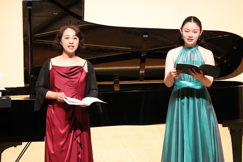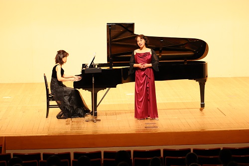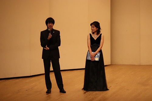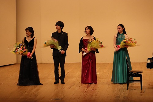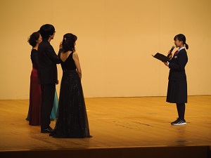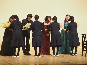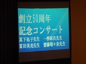 11月6日の合唱コンクールに続いて、50周年記念スクールコンサートを開催しました。本校合唱コンクールの審査員でもある真下祐子さんと本校卒業生の齋藤瑚々奈さんによる声楽と一柳麻衣さんによるピアノ伴奏、本校卒業生である富田英亮さんによるピアノ演奏が披露されました。澄んだ歌声と繊細なピアノの音色が響き渡り、会場は美しいメロディに包まれました。演奏が終わった後も、余韻に浸るような静かな感動が広がり、心に残るひとときとなりました。4人の皆さん、本当に素敵な演奏、ありがとうございました。真下先生は元東北文化学園大学特任教授で現在は惺山高校と山形北高校で講師を務めながら、ソプラノ歌手として活躍されています。一柳先生は山形北高校と東北文教大で講師を務めるとともにソロリサイタルや様々な楽団や演奏家とコラボし演奏活動をしておられます。富田さんは本校卒業後、山形北高、東京音楽大学に進み、現在、東京音大ピアノ演奏研究員として活躍されています。齋藤さんは本校を卒業後、山形北高、国立音大を卒業し、声楽(メゾソプラノ)を続けていらっしゃいます。