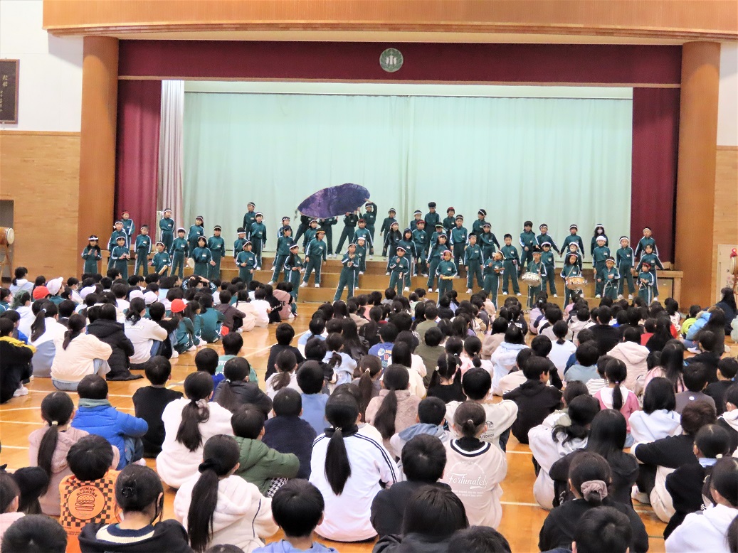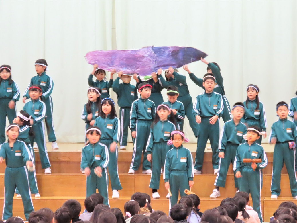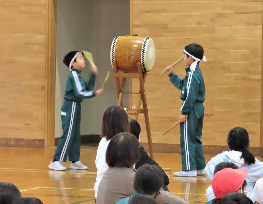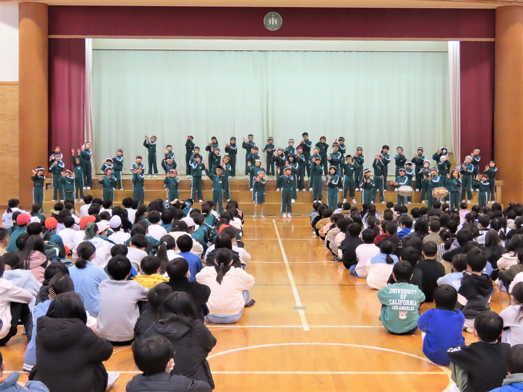 2年生は、国語・音楽で学習した、歌とリズム打ち、詩の群読の発表をしました。歌とリズム打ちでは、振り付けを入れたり、体の一部を使ったリズム打ちをしたりと、工夫して表現していました。市の群読も、長い詩を覚えるだけではなく、動きも入れながら発表しました。きっと発表会に向けて、家庭でもがんばって暗唱に取り組んだ子どもが多かったのではないかと思います。