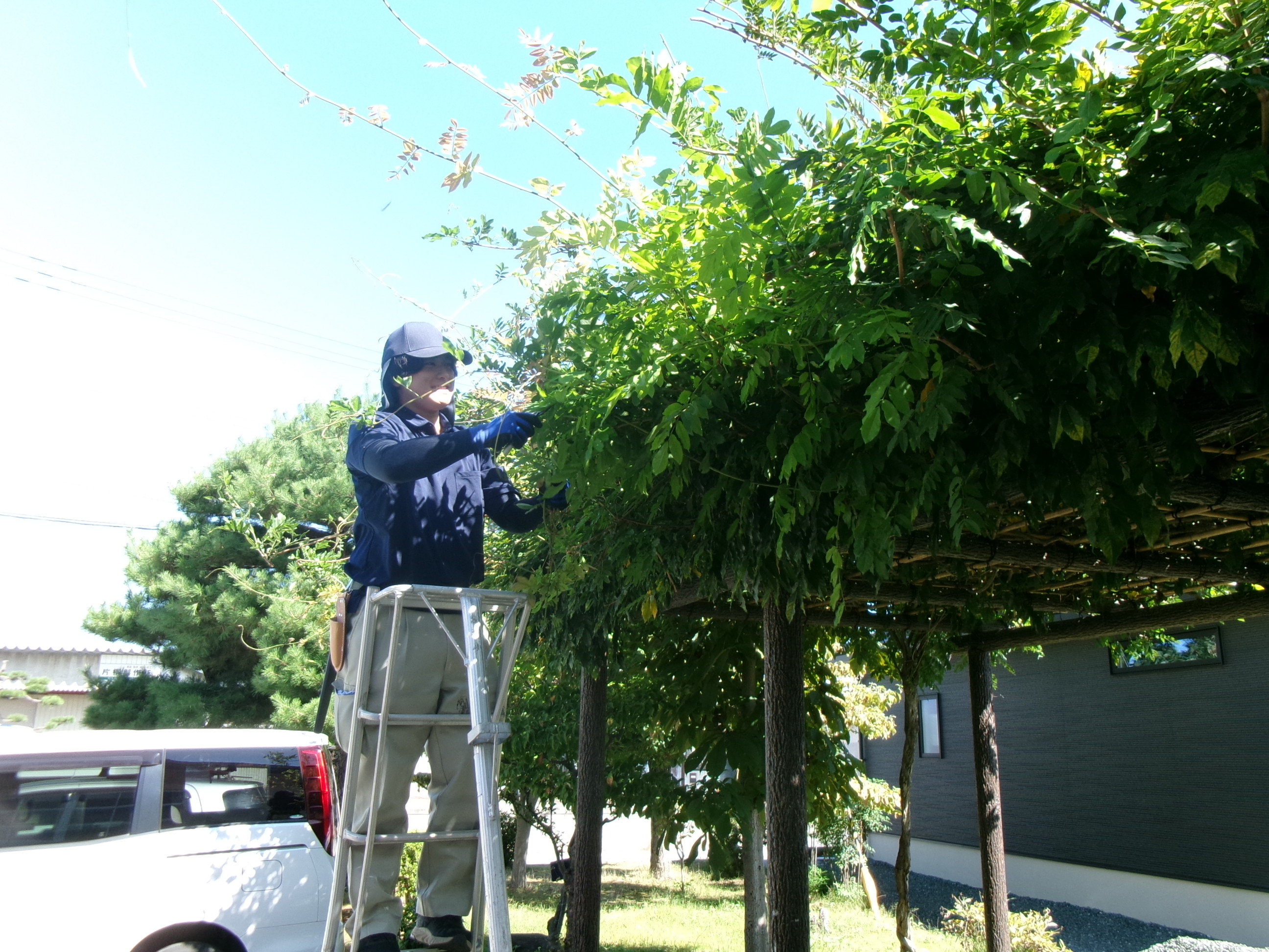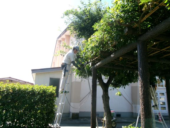 本校の技能主査さん及び技能技師さんお二人により、本校のシンボルはなふじの剪定作業をしていただきました。