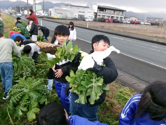 降雪があるなど外は寒さが厳しくなってきましたが、本日は、たいよう学年(第2学年)の子どもたちが、本校同窓会長 長瀬正美 様のご指導のもと、大根の収穫を行いました。