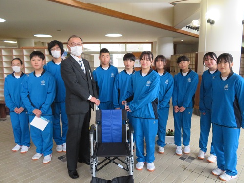山寺地区の「介護老人保健施設サニーヒル山寺」様へ、山寺中学校の生徒会を中心に回収したアルミ缶を車椅子に交換し、寄贈いたしました。保護者・地域の皆様のご協力をありがとうございました。
