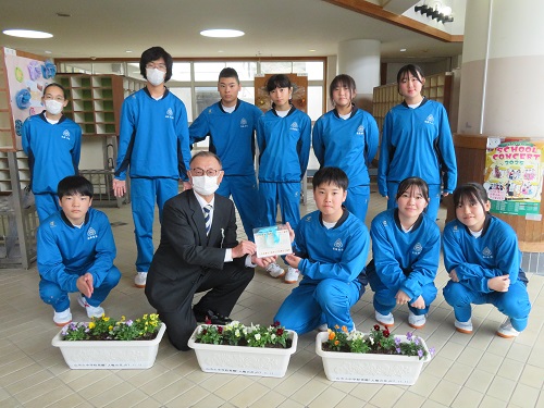 また、今年度初めて参加した「人権の花運動」の一環で、パンジーを植栽したプランターを一緒に寄贈しました。利用者の方々の気持ちが明るくなることを願っています。