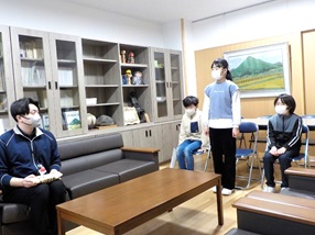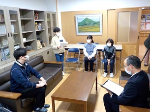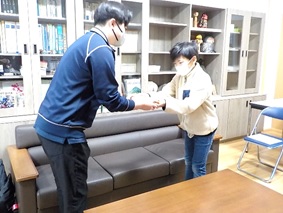 社会福祉協議会の方をお迎えし、全教室生放送で赤い羽根募金贈呈式を行いました。