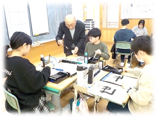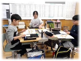 6年書写では、自分の心を表す一字を表現しています。この日は、ちょこっとサポーター(ちょこサポ)で高橋宗一先生が来てくださりました。手本を示していただいたり、ちょっとしたアドバイスをいただいたりしたことで、子どもたちは心を込めて真剣に書くことができ、とても上手になりました。