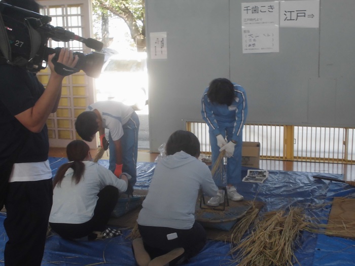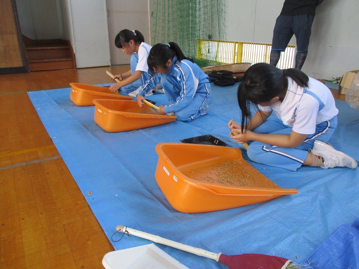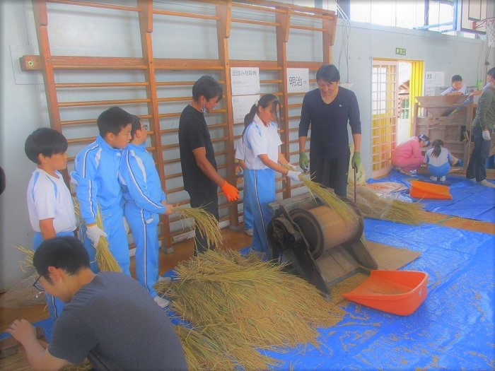 9月26日(金)4・5年生が昔の脱穀の体験をしました。4つの道具について説明を聞き、おうちの方から協力していただきながら作業をしていきました。