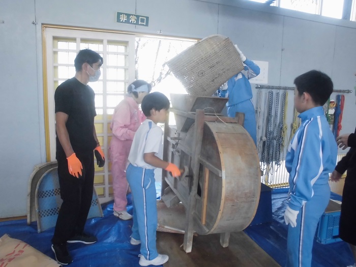 9月30日(火)3時間目には、田んぼの先生に教わりながら現代の脱穀の体験をしました。