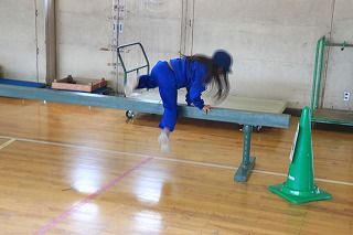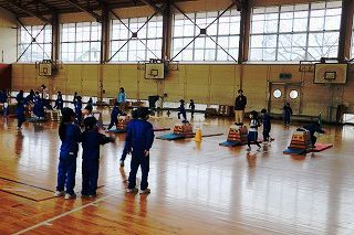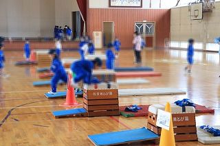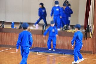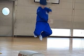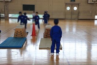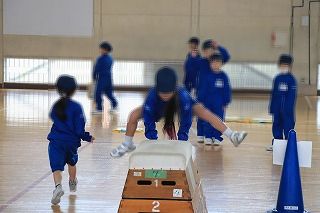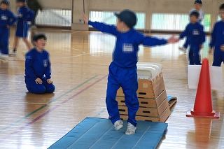 12/15(月)1年生の体育の様子です。跳び箱を使った運動遊びは,跳び乗りや跳び下り,手を着いてのまたぎ乗りやまたぎ下りをして,それらができる楽しさに触れることができる運動遊びです。平均台やステージなども使って、みんな楽しく取り組んでいました。