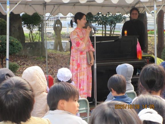 今回の演奏は「シンガソングライターの南壽あさ子さん」です。ピアノの優しい音色と、澄んだ歌声が中庭に響きました。虹が出て、青空ものぞく中、とてもステキな時間でした。