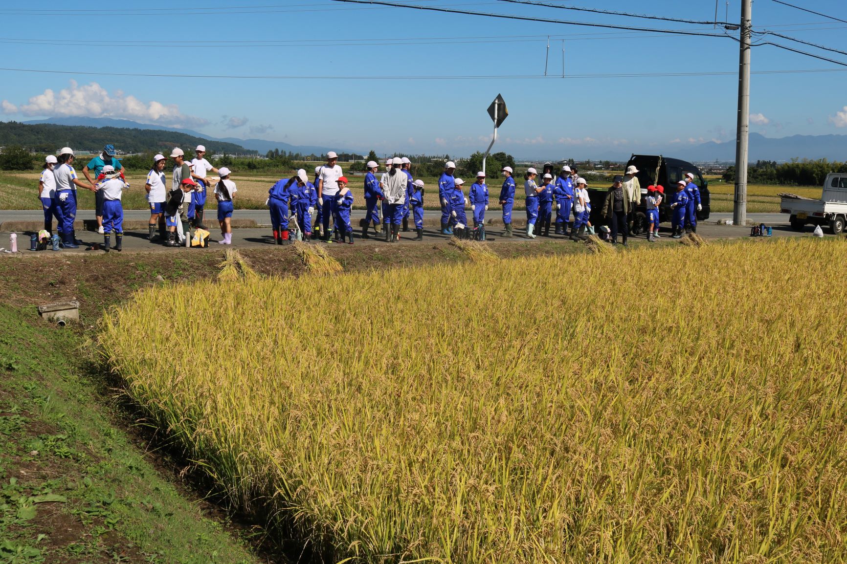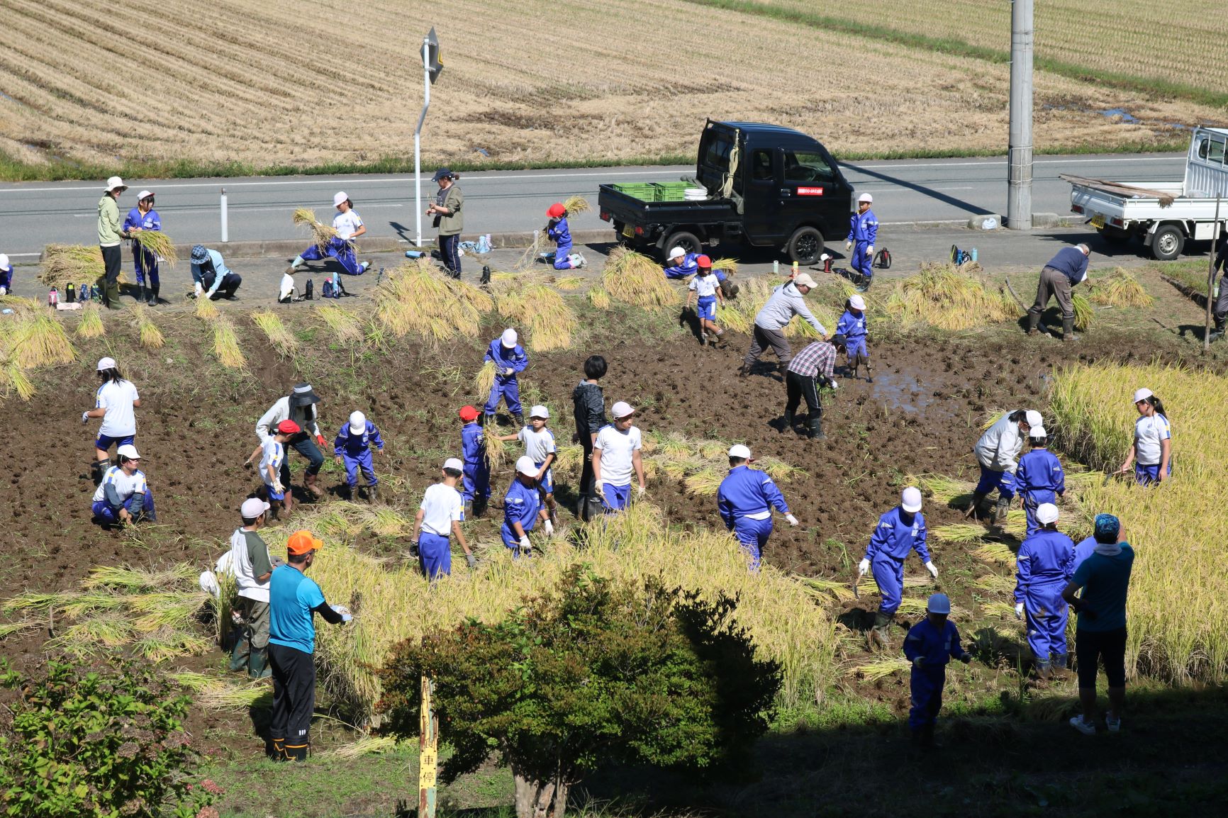 前日の雨でぬかるみはありましたが、秋晴れのもと、田んぼの先生からも来ていただいて約2時間の作業となりました。